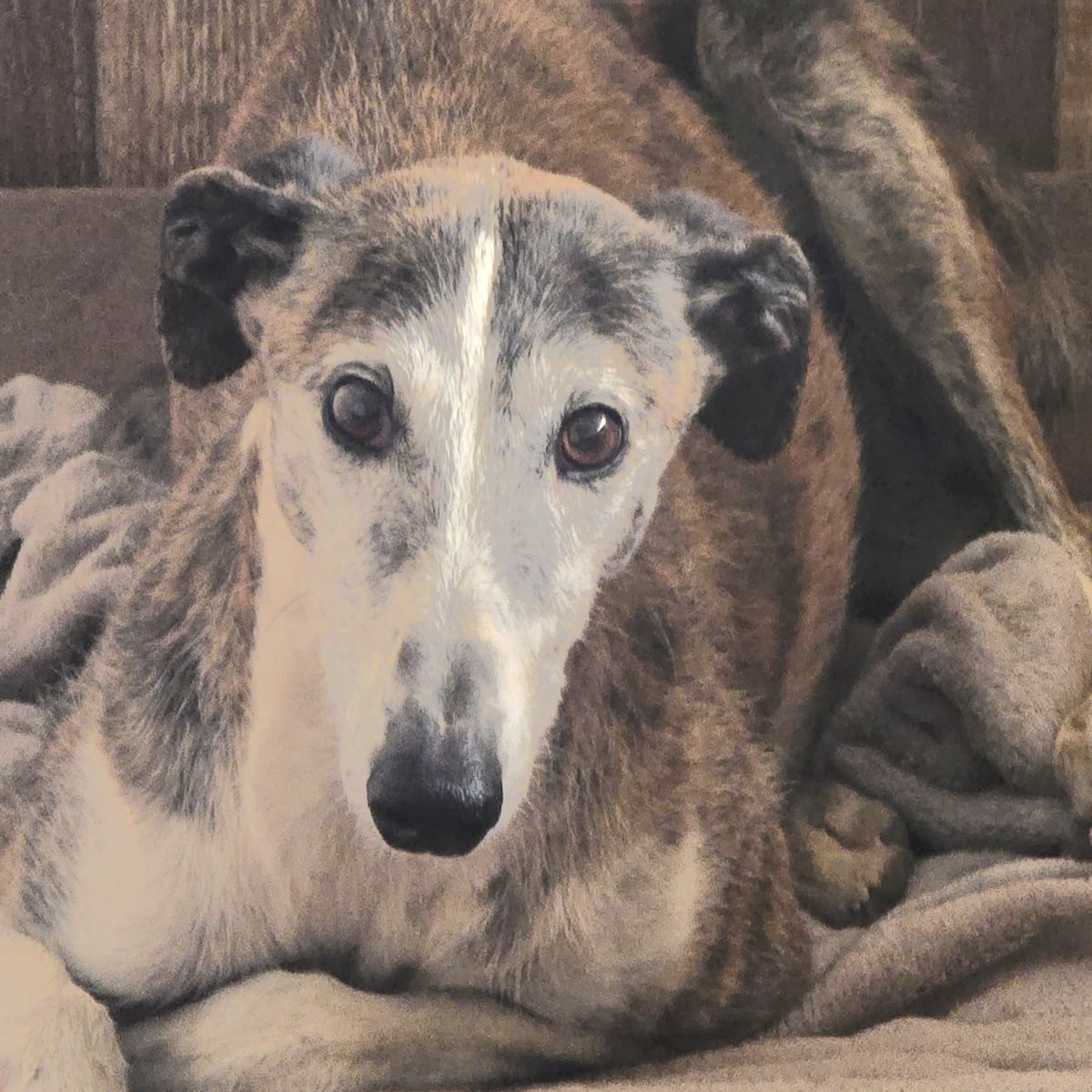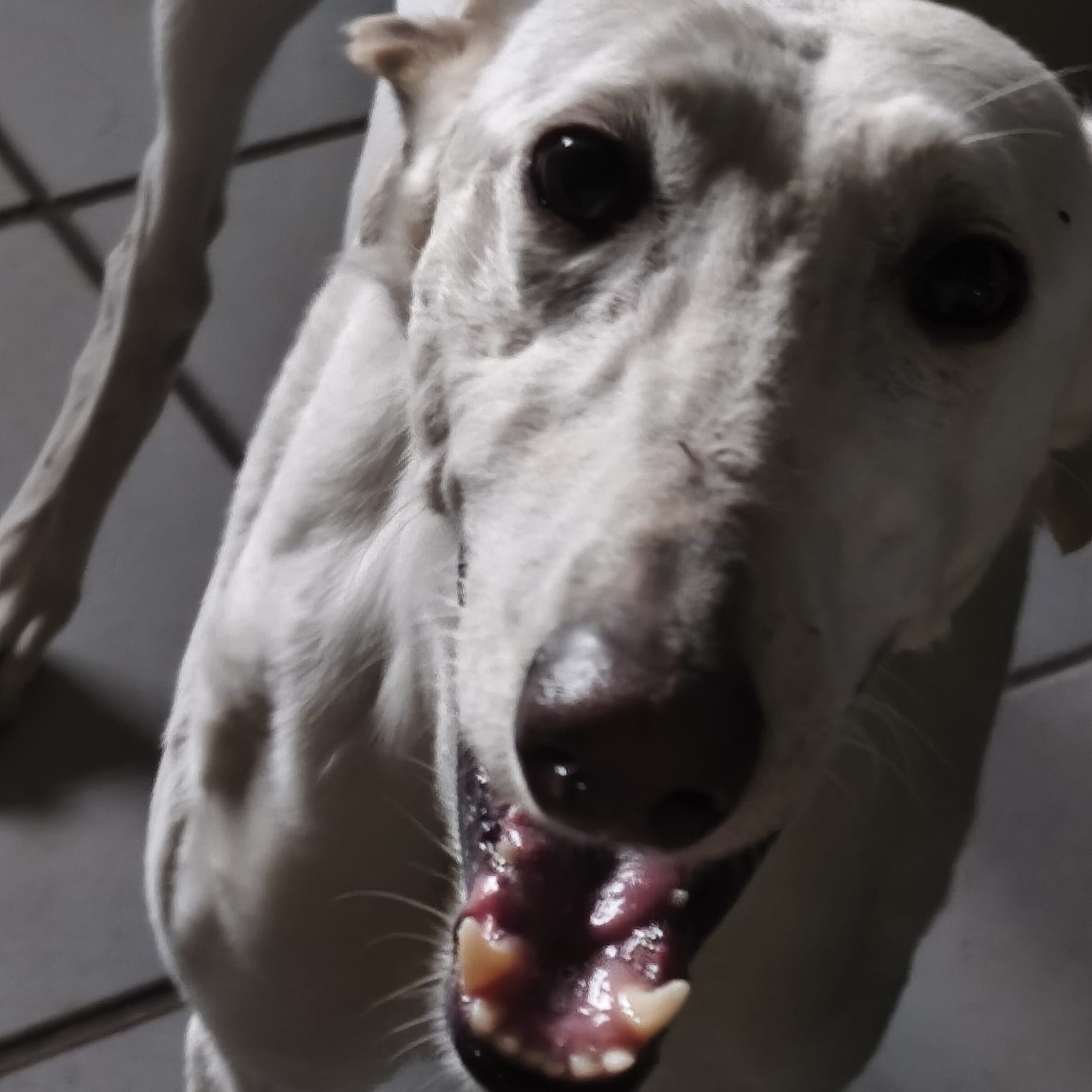 Es muy bueno, un poco tímido al principio. Aunque con todos los galgos hay que tener cuidado, con Voltor todavía más, porque a pesar de que no es muy miedoso, de primeras intenta escapar, sólo necesita tener confianza en su adoptante, es muy buen perro.